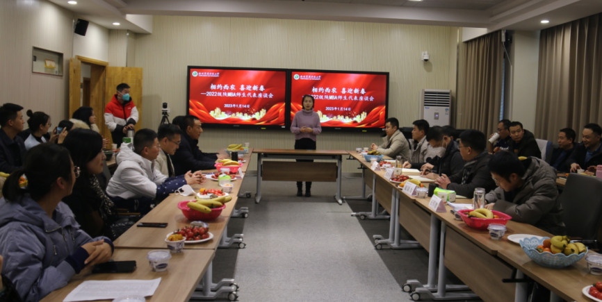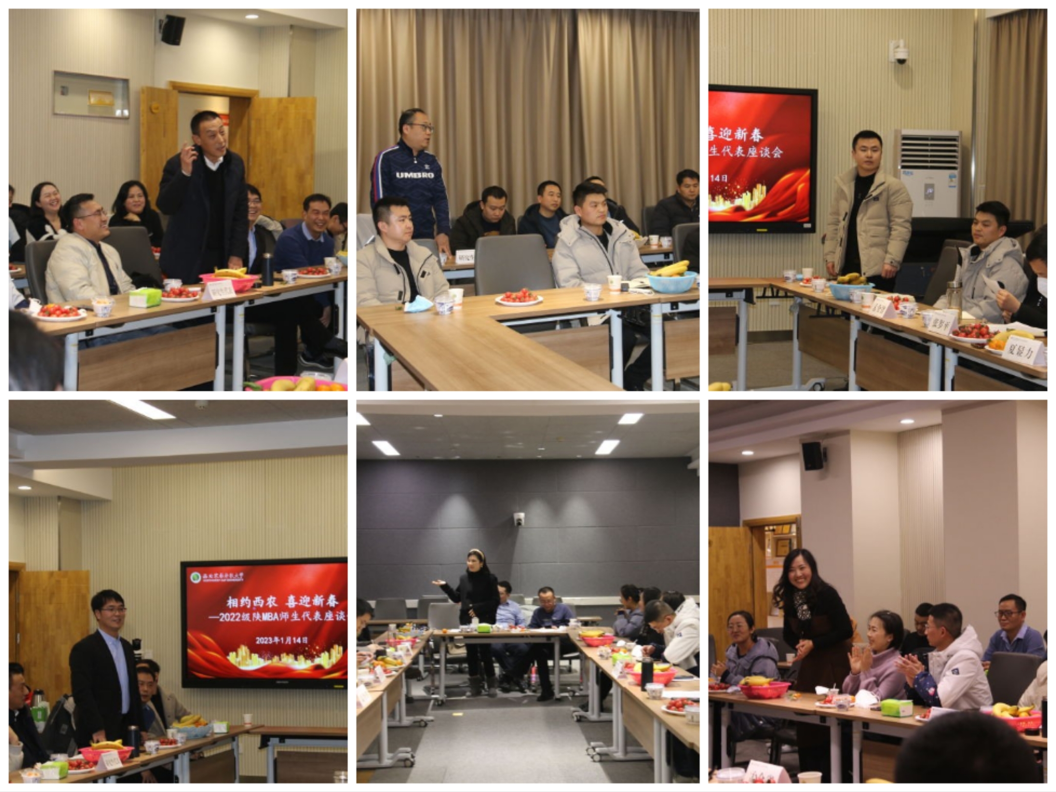1月14日,农历腊月二十三,中国北方的传统小年,是喜庆团圆的日子。澳门永利6774“相约西农 喜迎新春”—2022级陕MBA师生代表座谈会在学院C403会议室欢乐举行。学院党委书记张岁平,院长、MBA教育中心主任夏显力、中心常务副主任孟全省、副主任王军智和2022级陕MBA各班30多位同学代表参加座谈会。